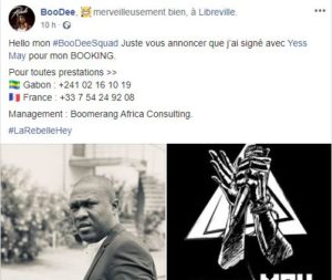 La journée du 8 octobre a été particulière pour l’imprésario le plus en vue du moment au Gabon, Yess May. Au moment où il annonçait sur la toile les menaces dont ses artistes sont victimes sur les réseaux, Boo Dee aka 2Niz annonçait à sa #BooDeeSquad la singature d’un contrat de booking avec Yess May Event et Boomerang Africa Consulting pour le management.