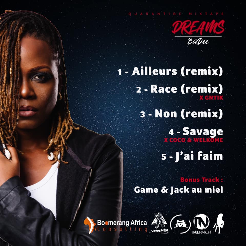 BooDee a récemment partagé la tracklist de sa dernière production, une mixtape de 6 titres dont un bonus track. « Mbolo samba chers fans de la musique gabonaise… On commence la semaine avec une excellente nouvelle pour vous. « La rebelle BooDee fera son retour ce 14 août avec la mixtape « DREAM » qui sera disponible exclusivement sur notre site www.gstoremusic.com », pouvait – on lire sur le compte Facebook de l’artiste.