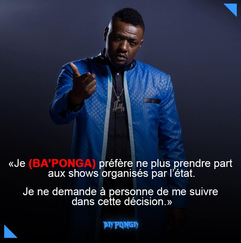 Face à la campagne qui suivi sa décision de ne point participer au festival Gabon 9 Provinces de cette année à travers le son post: « Gabon 9 Provinces, J’y serai pas. Le Statut de l’artiste est plus important que le cachet » du 25 septembre dernier, Ba’Ponga a récidivé avec une autre communication dans laquelle il annonce sa volonté de ne plus « prendre part aux shows organisés par l’Etat ».  Puis, le rappeur dans un texte explicite a justifié sa décision. « Avoir les projecteurs sur nous, prendre la parole, expliquer à l’opinion publique comment et combien de fois la Culture Gabonaise et le Ministère qui en assure la tutelle sont négligés dans notre pays; relever le fait que depuis l’accession du Gabon à l’indépendance, à aucun moment la culture et les arts n’ont représenté une priorité, ni eu d’importance aux yeux de nos dirigeants, sont là des faits qui donnent l’impression qu’être artiste est une tare, et qu’être nommé Ministre de la Culture est une voie de Garage, une sanction » peut – on lire dans cette publication qui date du 28 septembre 2020. « La Culture et les arts au Gabon, doivent cesser d’être considérés comme de simples éléments de distraction ou de divertissement » .
